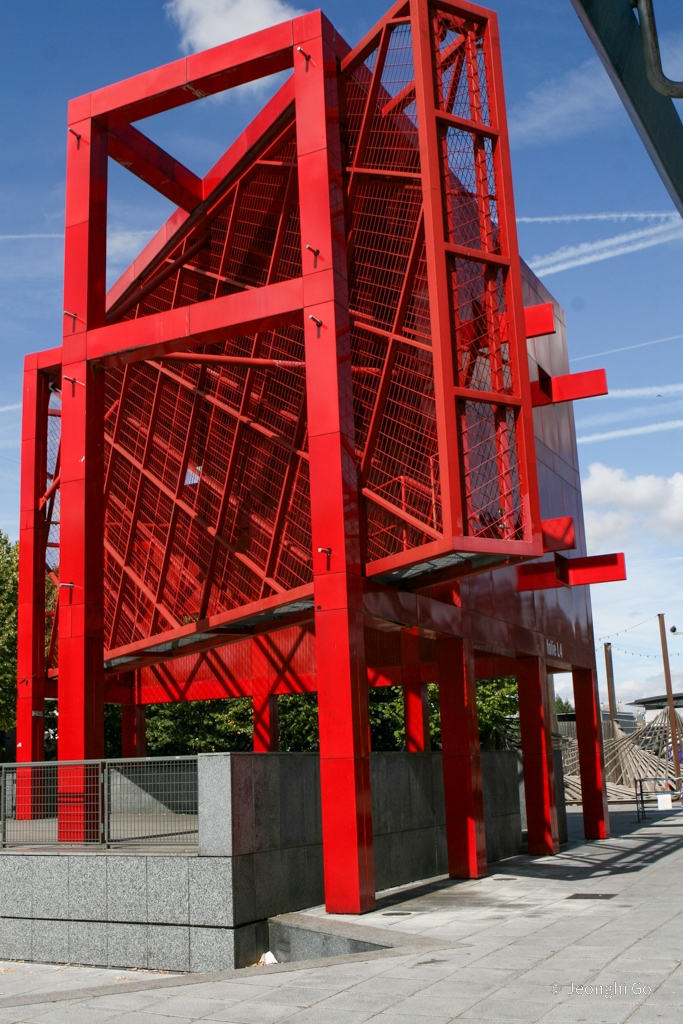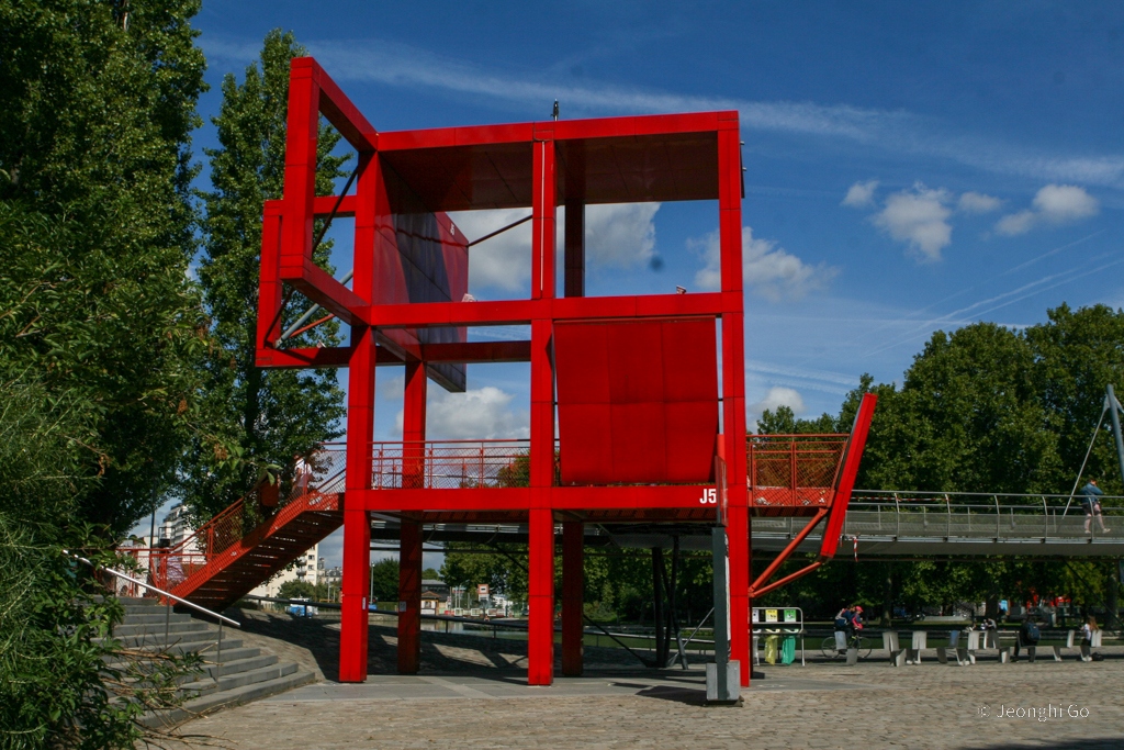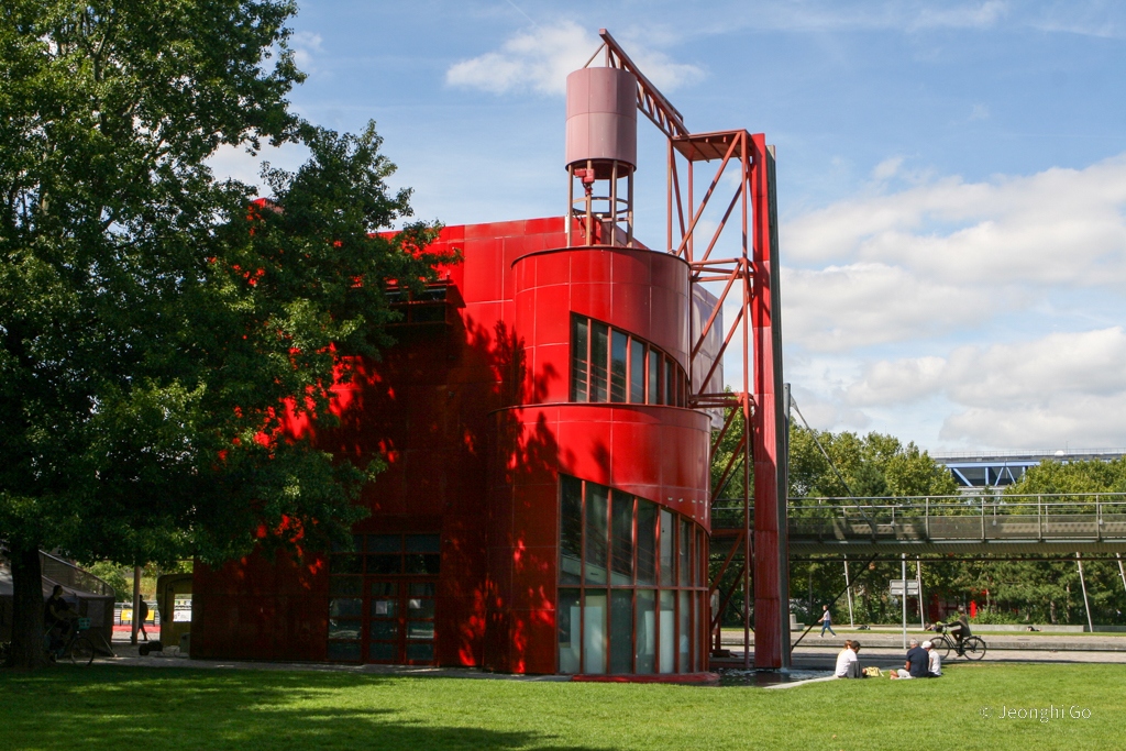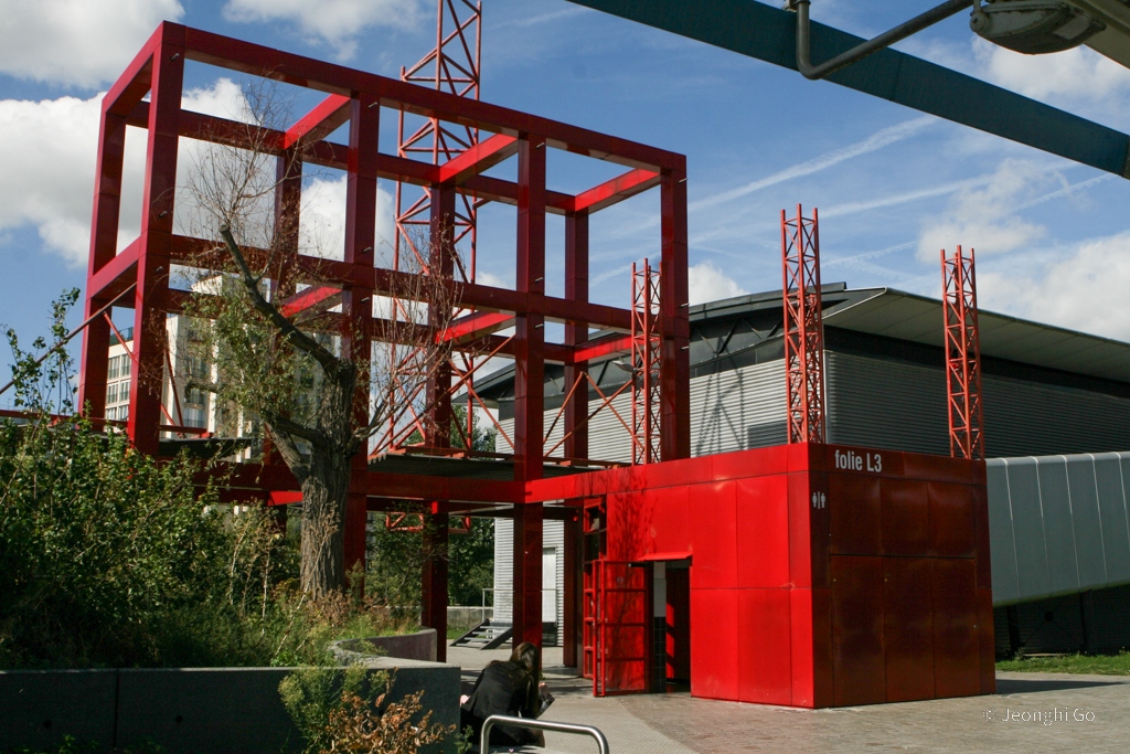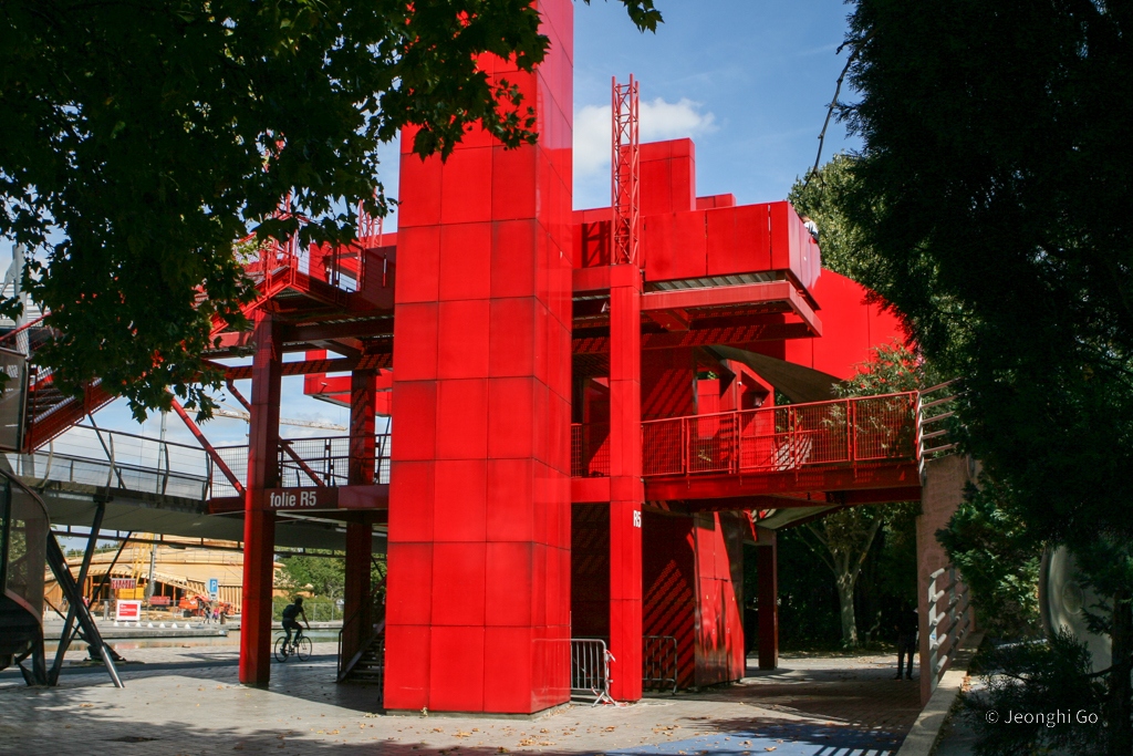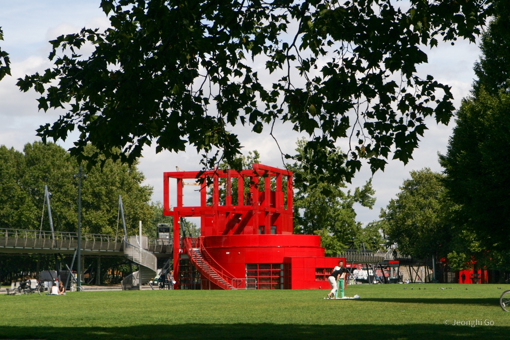 파리의 라빌레트공원에서 폴리La Folie(Madness)라 불리는 26개의 선홍색 구조물은 분명 눈에 띄는 요소들이다.  폴리는 본래  영국 풍경정원 시대에 유행했던 것인데 기이한  형상의 장식적 건축물을 뜻한다. 일반적으로 정원에 세워지는 전통적인 소건축물과는 달리 디자인이 요란하거나 기발한 것을 따로 폴리라고 불렀다. <하릴없는 것들>이라고 해도 좋겠다. 특별한 기능은 없고 뷰포인트에 세워 눈길을 끌거나 때로는 멜랑꼴리한 감성을 자아내는 것이 그 기능의 전부였다. 사실 매우 중요한 기능이다.