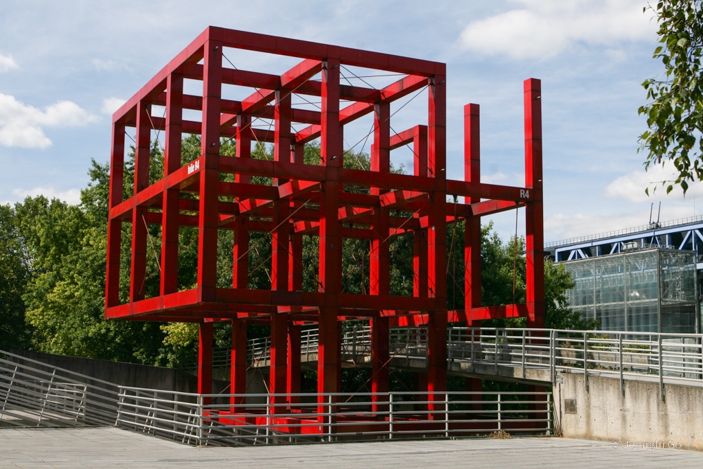 추미의 광기어린 ‘미치광이’들은  모두 예외 없이 선홍색의 철판구조물로 지었으며 정연한 격자형 좌표 시스템에 따라 배치하여 제복을 입히고 정렬한 것이 특이하다. 광기를 잠재우려는 방식일지도 모르겠고 스위스 신사 추미의 강박증의 산물일 수도 있다. 격자의 크기는 120미터. 각 폴리는 12 x 12 x 12 m의 큐브형 기본형태를 가지고 모두 3층이다. 이 기본구조를 유지한 채 원형, 나선형 등의 구조물을 추가로 덧붙여 서로 구분했다.